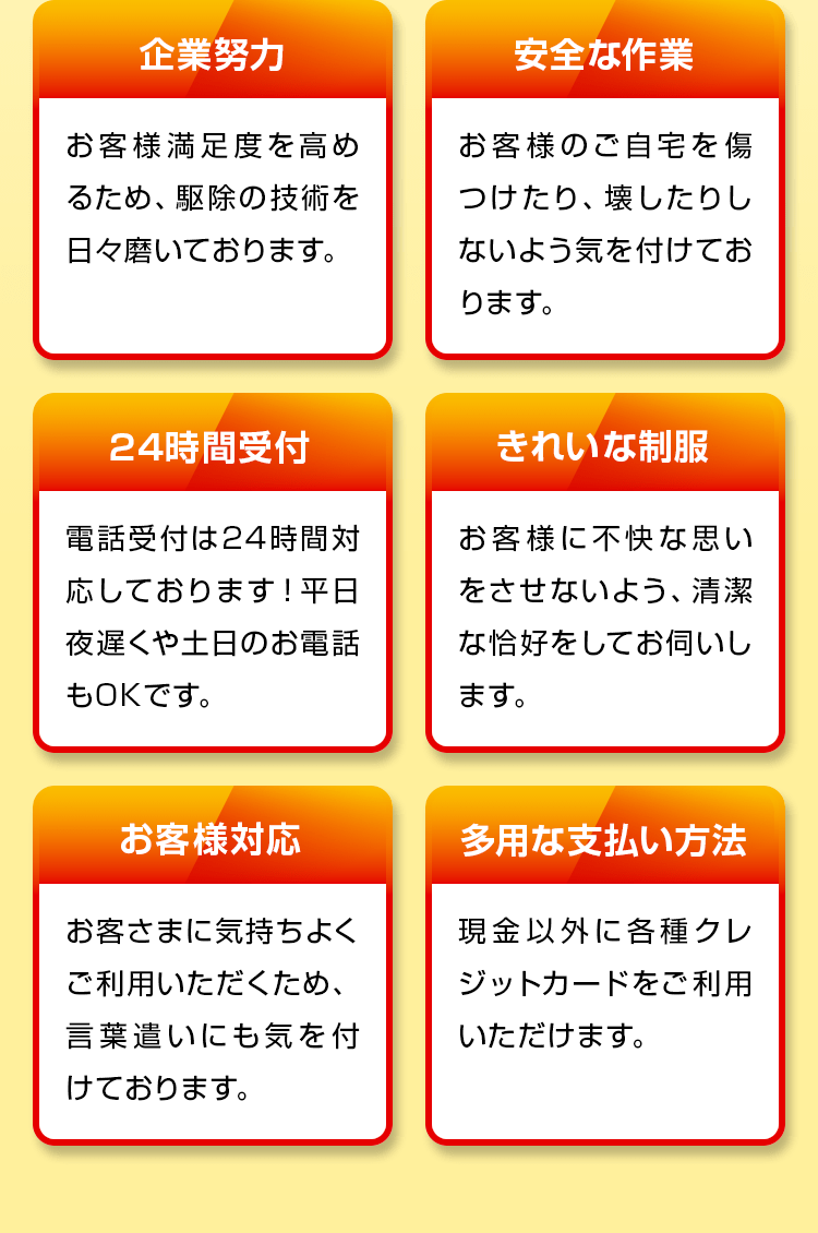 弊社で害獣が再発しないよう、独自のマニュアルで作業後の点検を行っています。また、万が一作業直後に気になる点が生じた場合はすぐにご連絡ください。スタッフ一同、すぐにご対応させて頂きます。