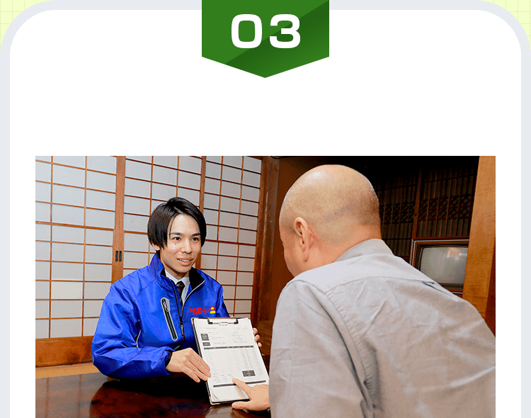 害獣駆除サポートでは作業前にお見積りをお出しいたします。お客様の承諾がない限り、作業や請求が発生することはありませんのでご安心ください。
